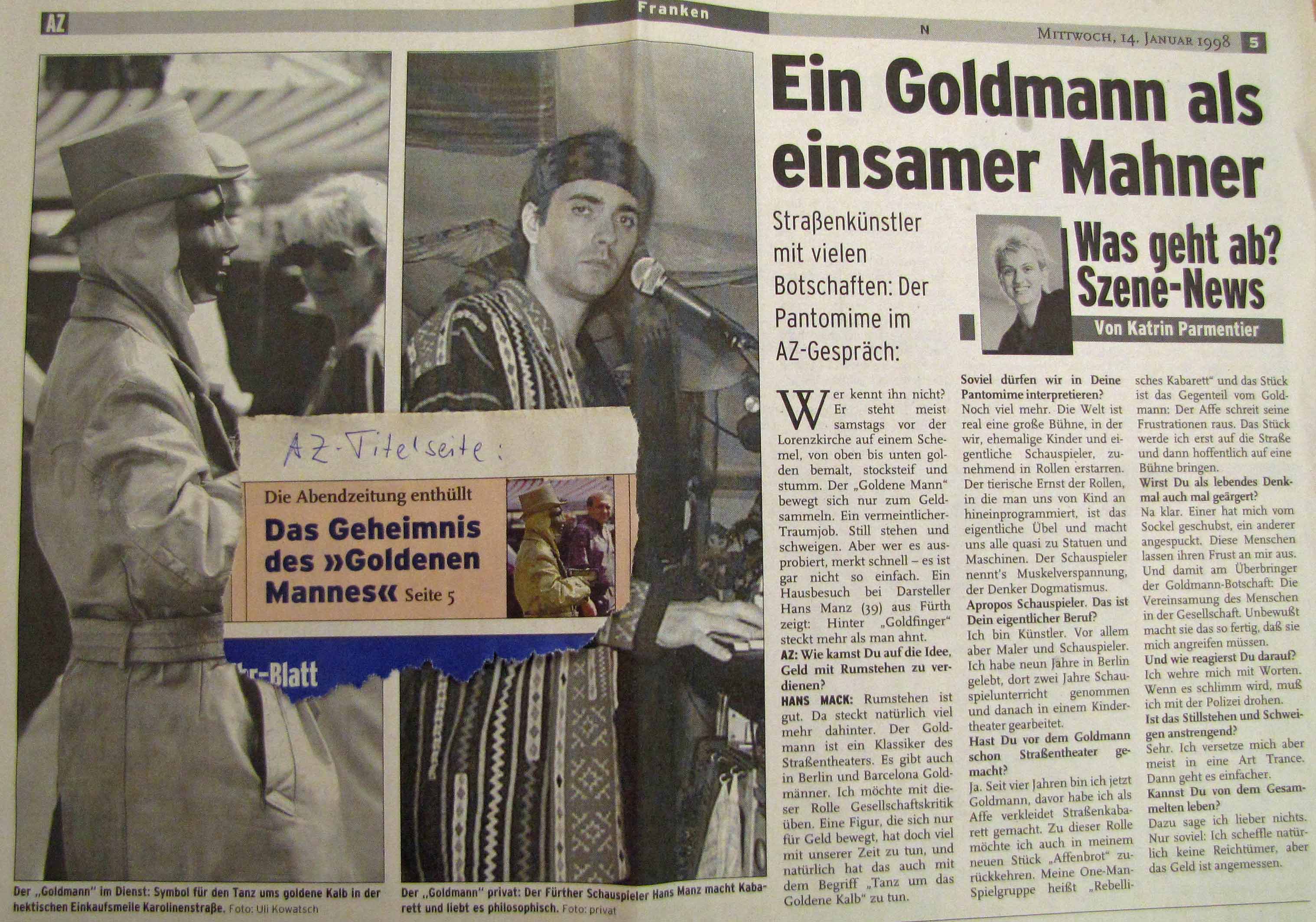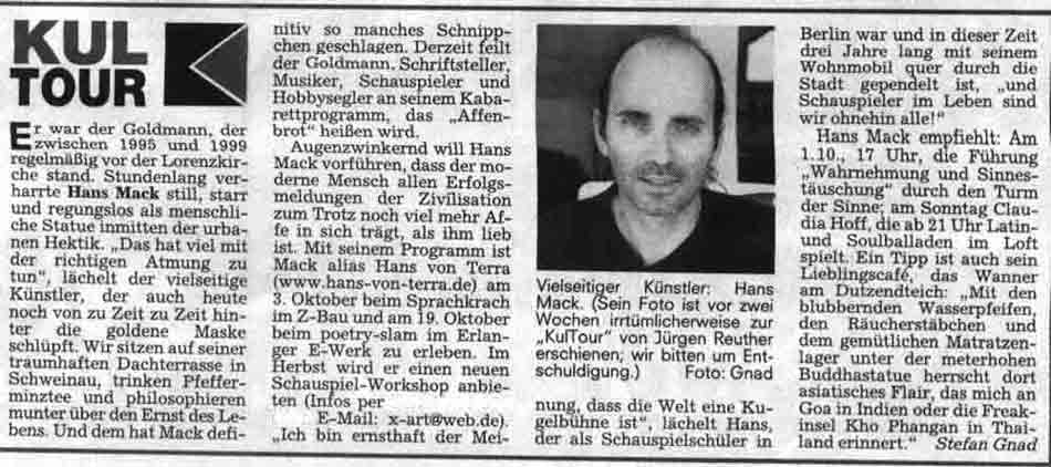 Neo von Terra | Aktuelles | Kabarett | Schauspielunterricht | Goldmann | Projekt RealTheater | Malerei| Texte | Songs | Videos | Vita | Presse | Kontakt | Datenschutz | Impressum PRESSEARTIKEL Hans Mack - Goldmann - Neo von Terra: